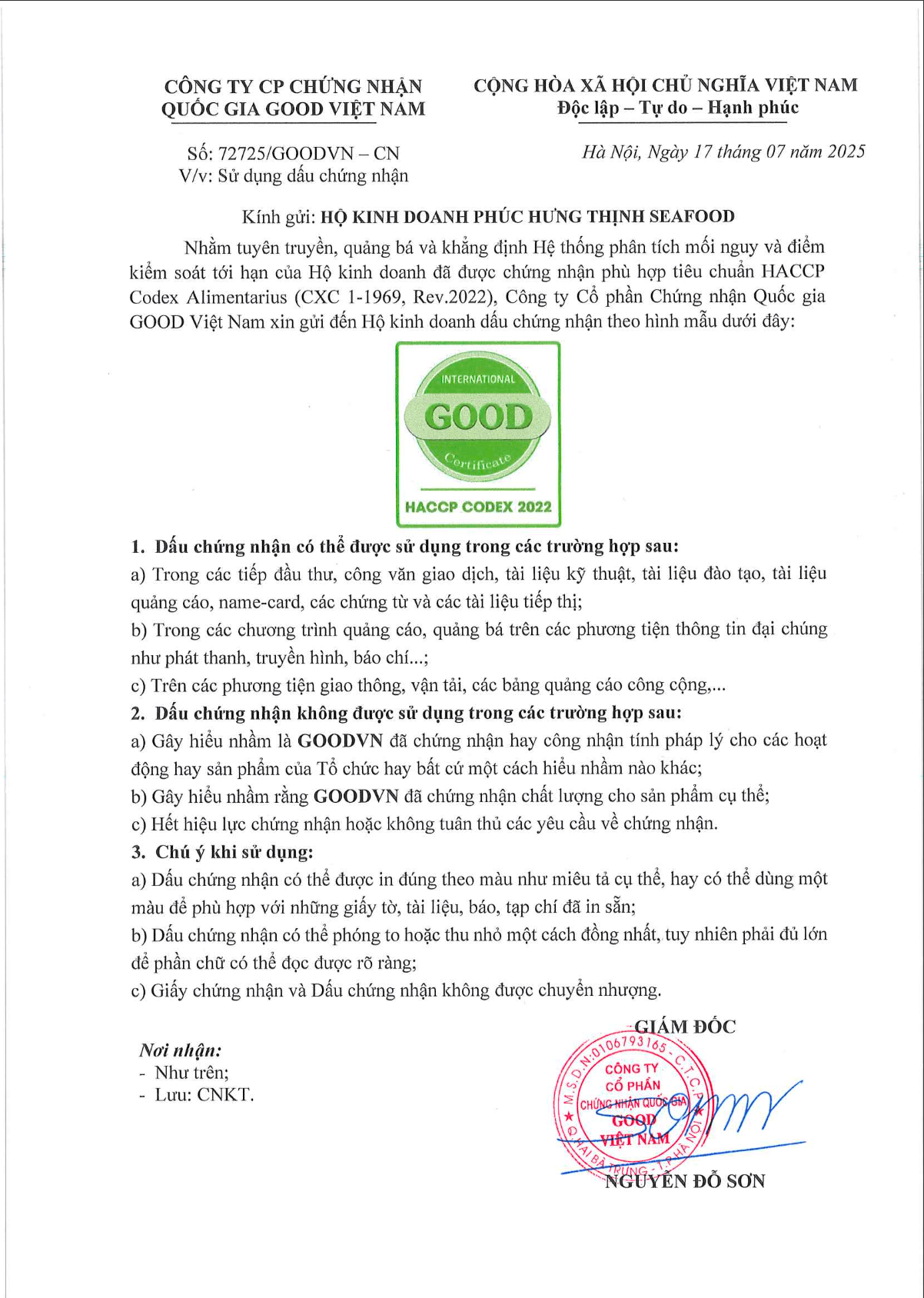 • Số chứng nhận HACCP: GOODVN72725 .HACCP